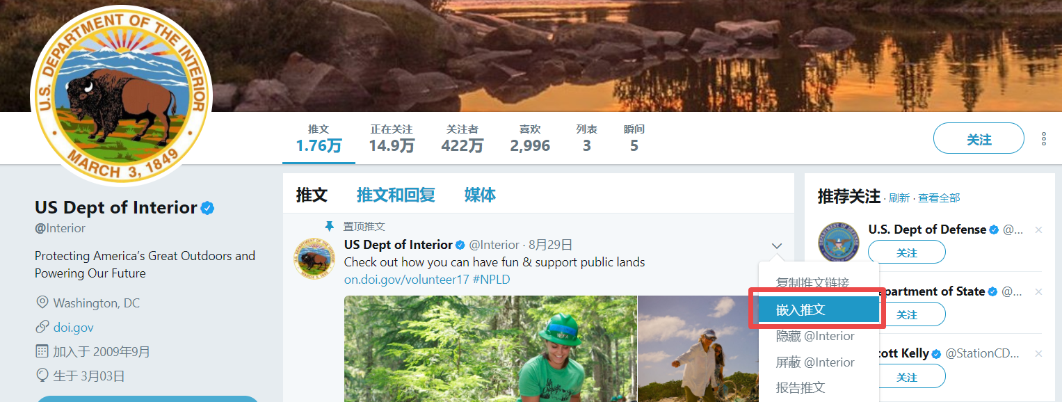 嵌入推文操作非常簡單,訪問任意的主頁,點擊要嵌入的推文右上角箭頭,選擇下拉中的“嵌入推文”按鈕,將得到的代碼複製到組件輸入框中即可。